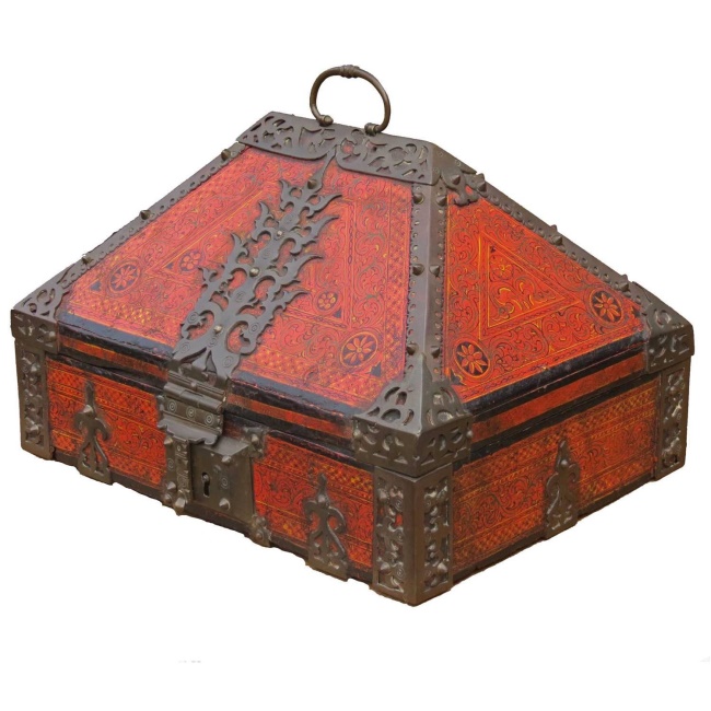 Traditional coffer is a marvelous mishmash of wood-carving, brass work and, occasionally, canvas skills that verve into it. The box is made with rose wood and embroidered with complex brass features evocative of the temple style.